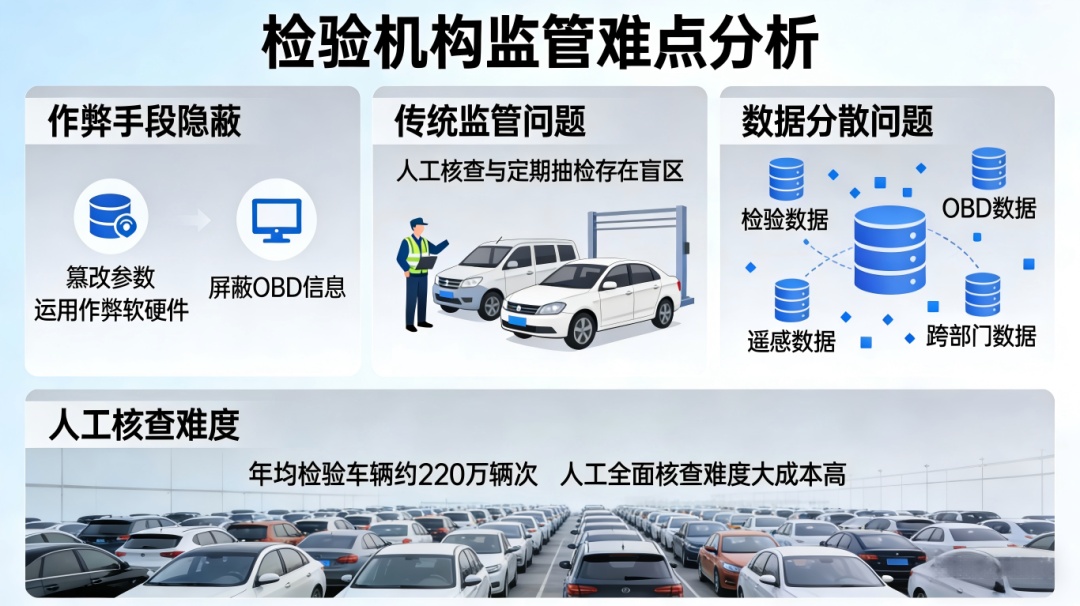 当前,检验机构的作弊手段极为隐蔽,例如篡改参数、运用作弊软硬件、屏蔽OBD信息等行为,传统监管手段难以识别。依赖人工核查与定期抽检的模式存在监管盲区,检验数据、OBD数据、遥感数据及跨部门数据较为分散,未能实现联动分析与闭环监管。同时,本市年均检验车辆约220万辆次,要对全市车辆检验情况进行人工全面核查,难度大且成本高。