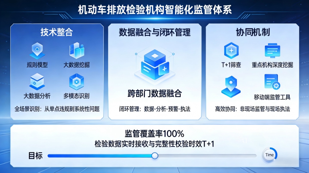 为贯彻落实相关政策、解决现存难题,上海市减污降碳管理运行技术中心整合规则模型、大数据挖掘、多模态识别等技术,达成从单点违规到系统性问题的全场景识别;融合多类跨部门数据,构建“数据—分析—预警—执法”的闭环管理模式。推行“T+1筛查”与“重点机构深度挖掘”模式,结合移动端监管工具,实现非现场监管与现场执法的高效协同。最终达成本市机动车排放检验机构和检测线监管覆盖率达100%;检验数据实时接收与完整性校验时效达到T+1,打造“政策落地有支撑、监管执行有方法、违规行为早发现”的智能化监管体系。