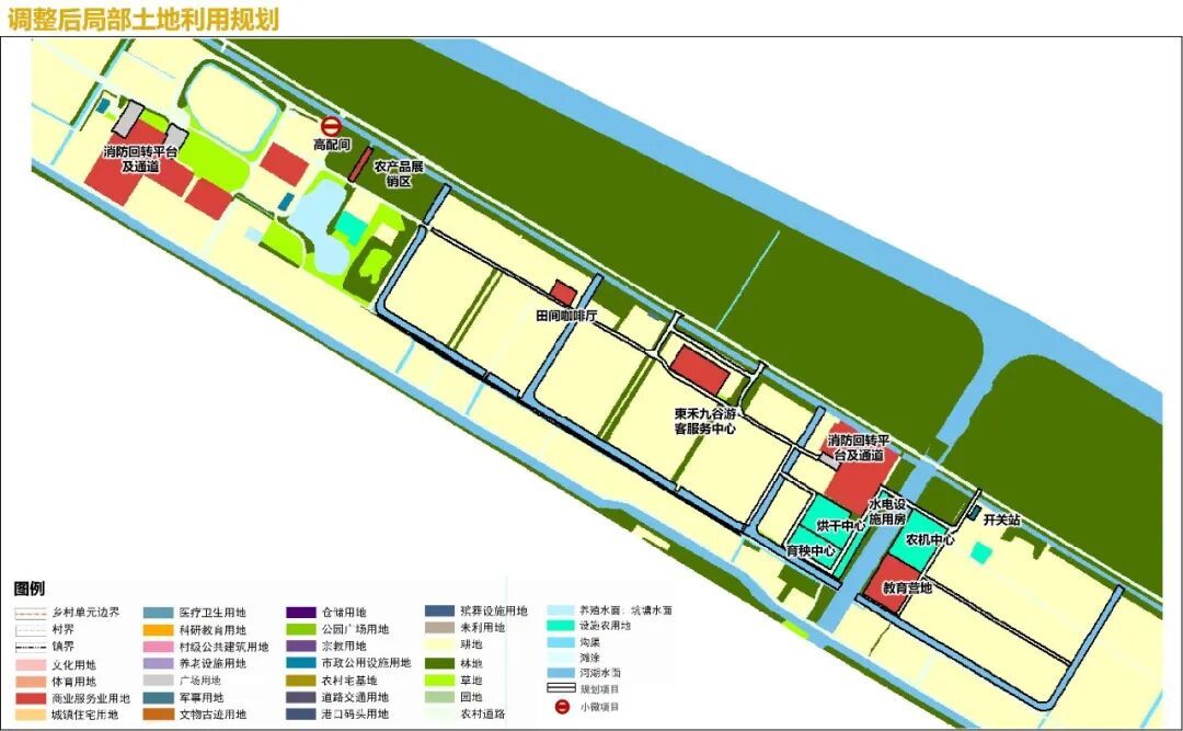 同时,随着东禾九谷开心农场由3A级景区向4A景区提升,在产业服务、基础配套、公共环境提升等方面需提升优化。规划建立了动态调整机制,并于2024年5 月批复《上海市崇明区竖新镇郊野单元村庄规划新征乡村单元(专项)调整》,适应乡村产业提升的实时需要。