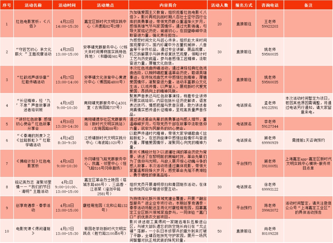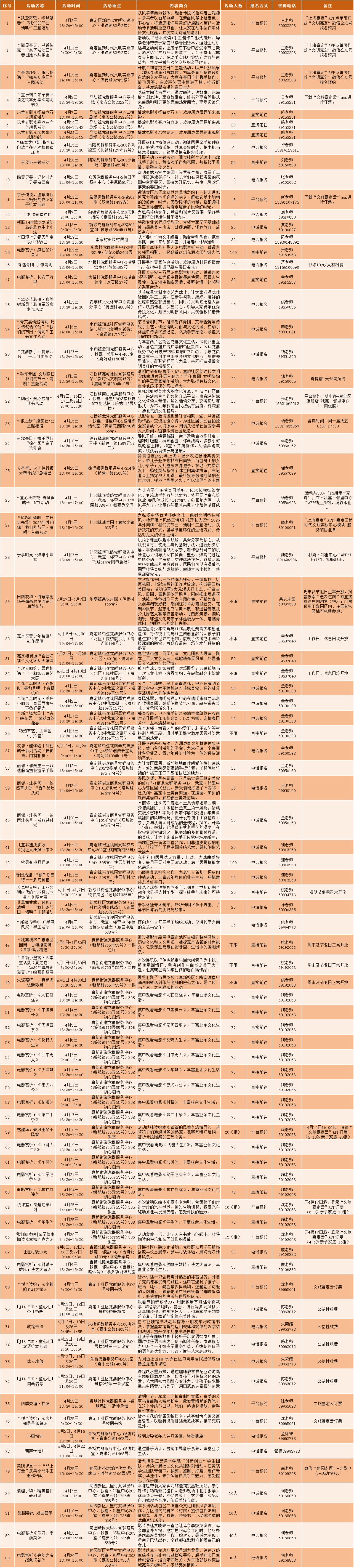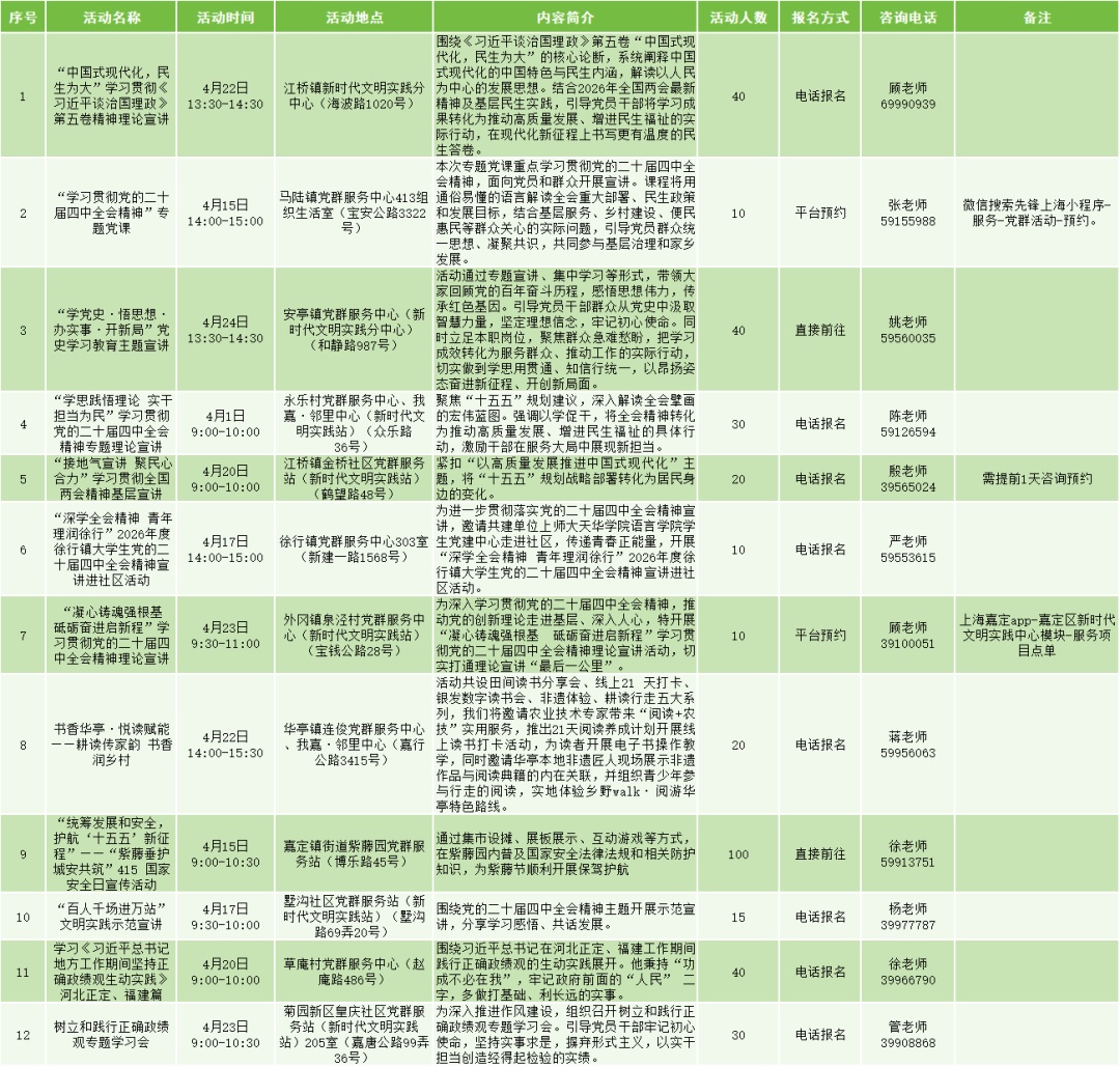 无论你想听党课“充电”、带娃体验非遗、找中医免费把脉,还是单纯想看场电影、学段瑜伽,这份 《嘉定区4月党群服务活动总菜单》 都能让你“一屏尽览、一键直达”。