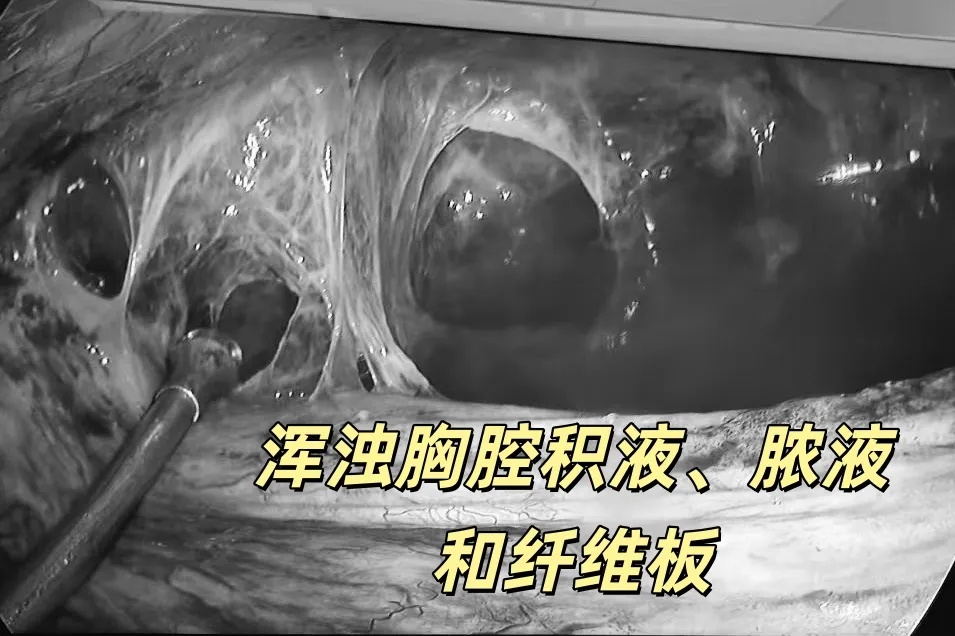 郭清奎主任主刀,仅在胸壁上开了一个3厘米的小孔。胸腔镜探入后,眼前的景象比预想的还要复杂,胸膜腔广泛粘连,纤维板肌化增厚死死压住肺组织,脓腔多房分隔,脓液浑浊。