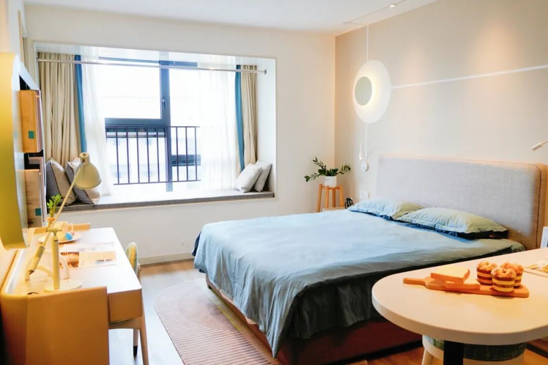 50平方米的崭新大开间,配有独立卫浴、餐桌、书桌和电视,甚至还有壁挂电视。
