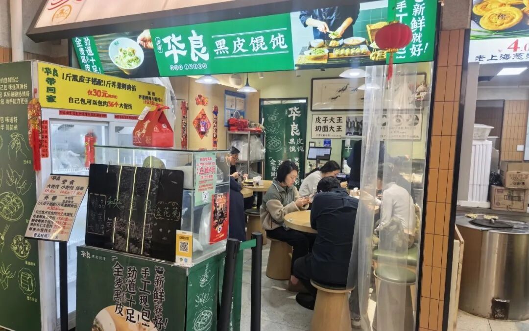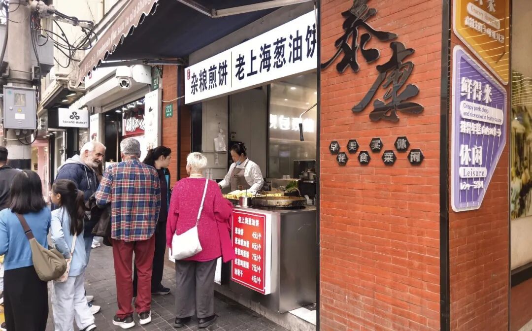 华良黑皮馄饨的摊位经常很热闹。听摊主介绍,外国游客很好奇黑全麦馄饨皮和创意馅料的制作过程,经常看到他们会举起相机记录这份新奇。百年老字号“鲜得来”的排骨年糕更是人气爆棚——外酥里嫩的排骨,裹满甜鲜酱汁的软糯年糕,一口下去,就是地道的上海味道。