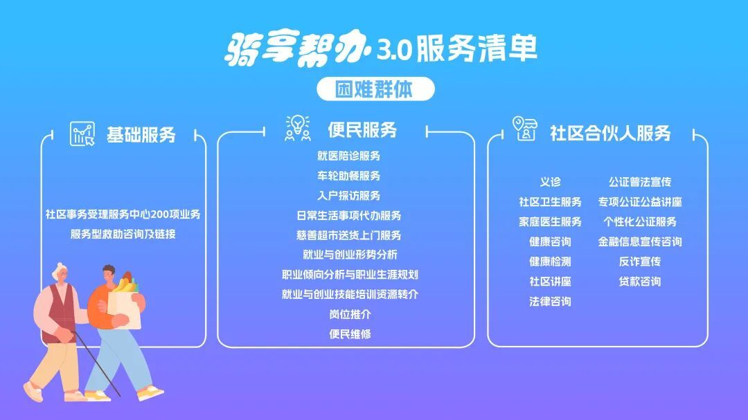 现场,“骑享帮办3.0”“骑享守护”服务体系发布。该体系以数智赋能推动社区民生服务提质升级,围绕三大核心内容展开: