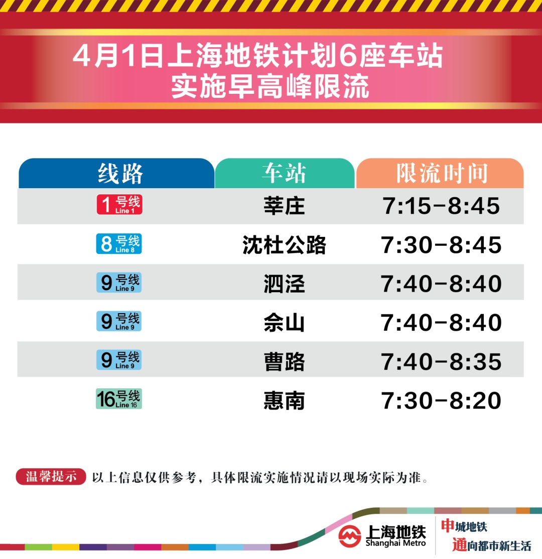 4月1日早高峰莘庄、佘山等6座地铁站计划限流