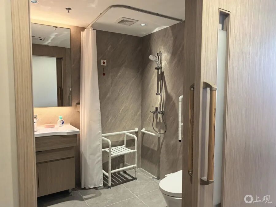 在一间朝南的“双人间”,记者看到:两张护理床,各自配有床头柜和衣柜,隔离帘一拉,保护了老人的隐私;房间门口配有沙发和茶几,作为两人的公共区域;每个房间都内设了独立卫浴。“房间总面积不变,人均面积几乎增加一倍,老人住得更加宽敞了,隐私性也更好了。”梁燚说。