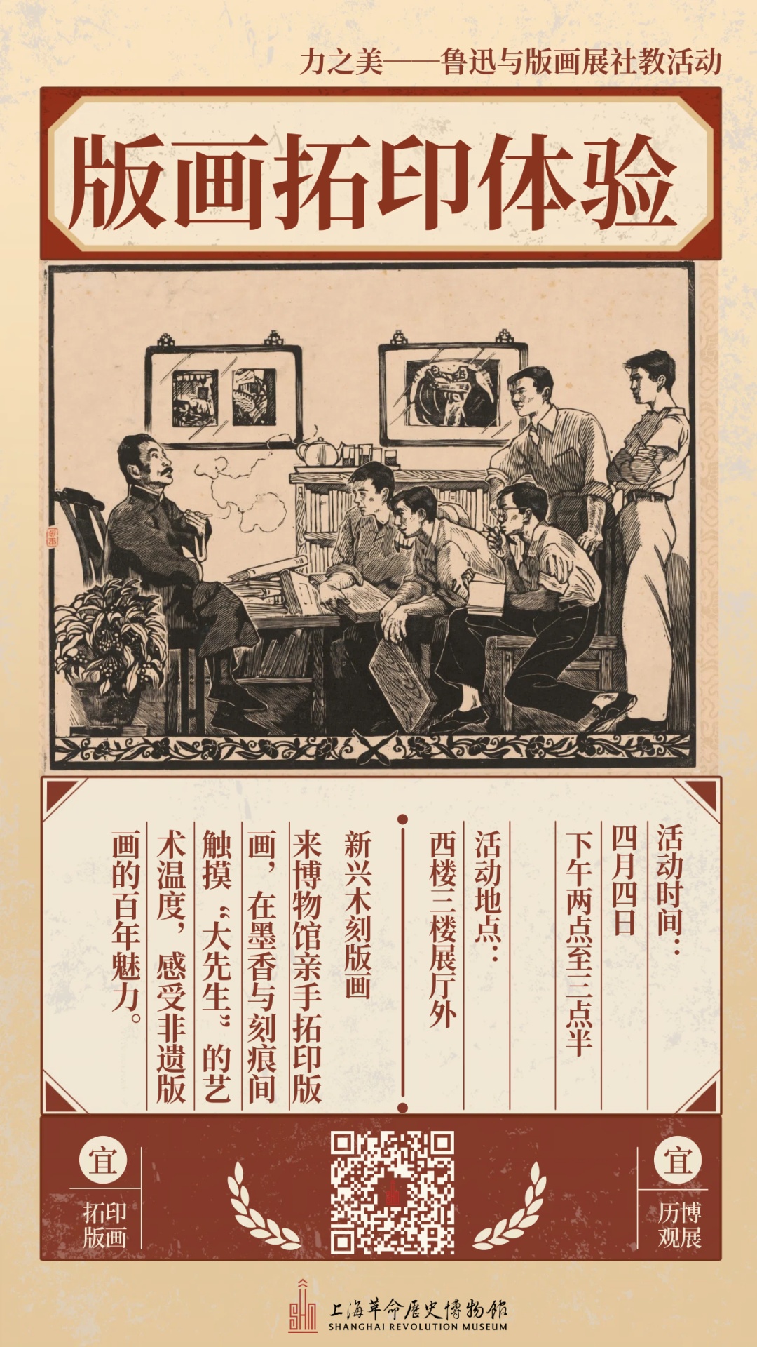 鲁迅是中国现代美术思想的先驱者,他洞察到木刻版画的强大生命力,并倡导了新兴版画。结合本次“力之美——鲁迅与版画”展,将联合北京鲁迅博物馆,开展版画体验活动,带领观众感受“大先生”与版画艺术的魅力。