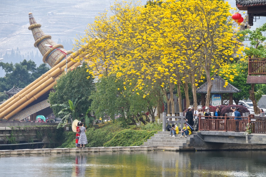 在牧羊河湿地公园,4.3公里的滨水步道串联起堤坝、观景台和长廊,漫步其中既能呼吸大围山国家级自然保护区的富氧空气,又能欣赏“山在花间流、人在花中游”的美景。在这里,不少游客穿上了苗族服饰,感受春日浪漫,体验民族风情。屏边苗族妇女服饰穿戴从头到脚都是由“花”点缀而成,这一身“花”来源于一针一线的挑花和刺绣。“穿上这身衣裳,算圆了自己苗族少女的梦,打卡拍照非常出片。”现场游客说道。
