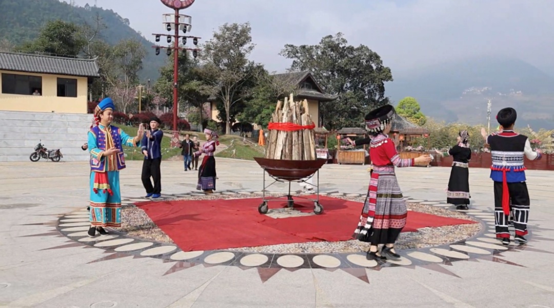 民族团结广场上,青年舞者在排练节目,音乐轻快,氛围热烈。在屏边,不仅有美景、美食,还有好听好看的民族歌舞和每周五晚热闹的篝火联欢。这里没有陌生人,只有一家人,不同民族、不同地域的人们手牵着手,围着熊熊燃烧的篝火,踏着专属屏边的“苗迪”音乐,跳出欢快的舞蹈,构成了一幅民族团结的生动画卷。