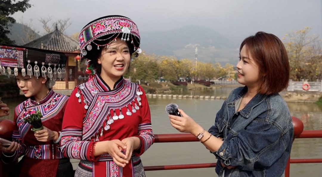 采访身着苗族服饰的游客