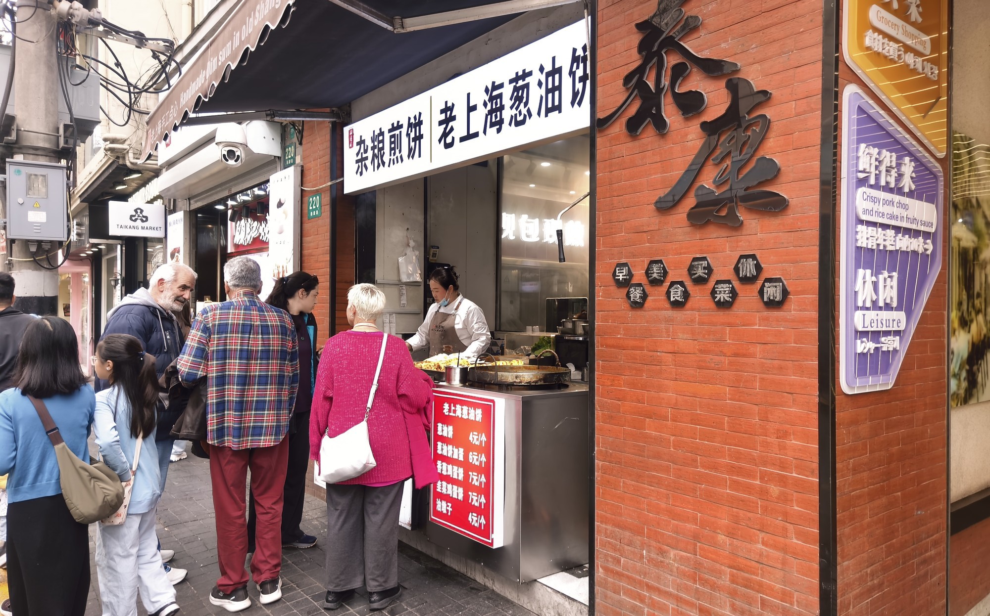华良黑皮馄饨的摊位经常很热闹。听摊主介绍,外国游客很好奇黑全麦馄饨皮和创意馅料的制作过程,经常看到他们会举起相机记录这份新奇。百年老字号“鲜得来”的排骨年糕更是人气爆棚——外酥里嫩的排骨,裹满甜鲜酱汁的软糯年糕,一口下去,就是地道的上海味道。
