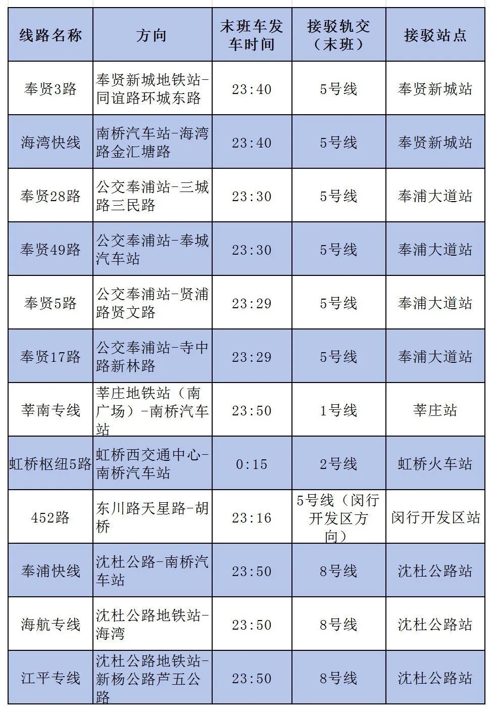 往奉贤方向接驳车末班车发车时间