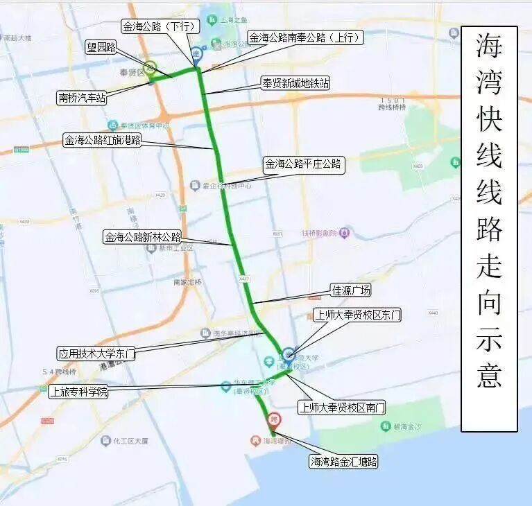 线路全长约14.3公里,从南桥汽车站出发,经停奉贤新城地铁站,直抵海湾大学城各所高校校门,终至海湾路金汇塘路,全程仅设12个站点,平均运营时间35分钟左右,发车间隔10至15分钟,单程票价2元。