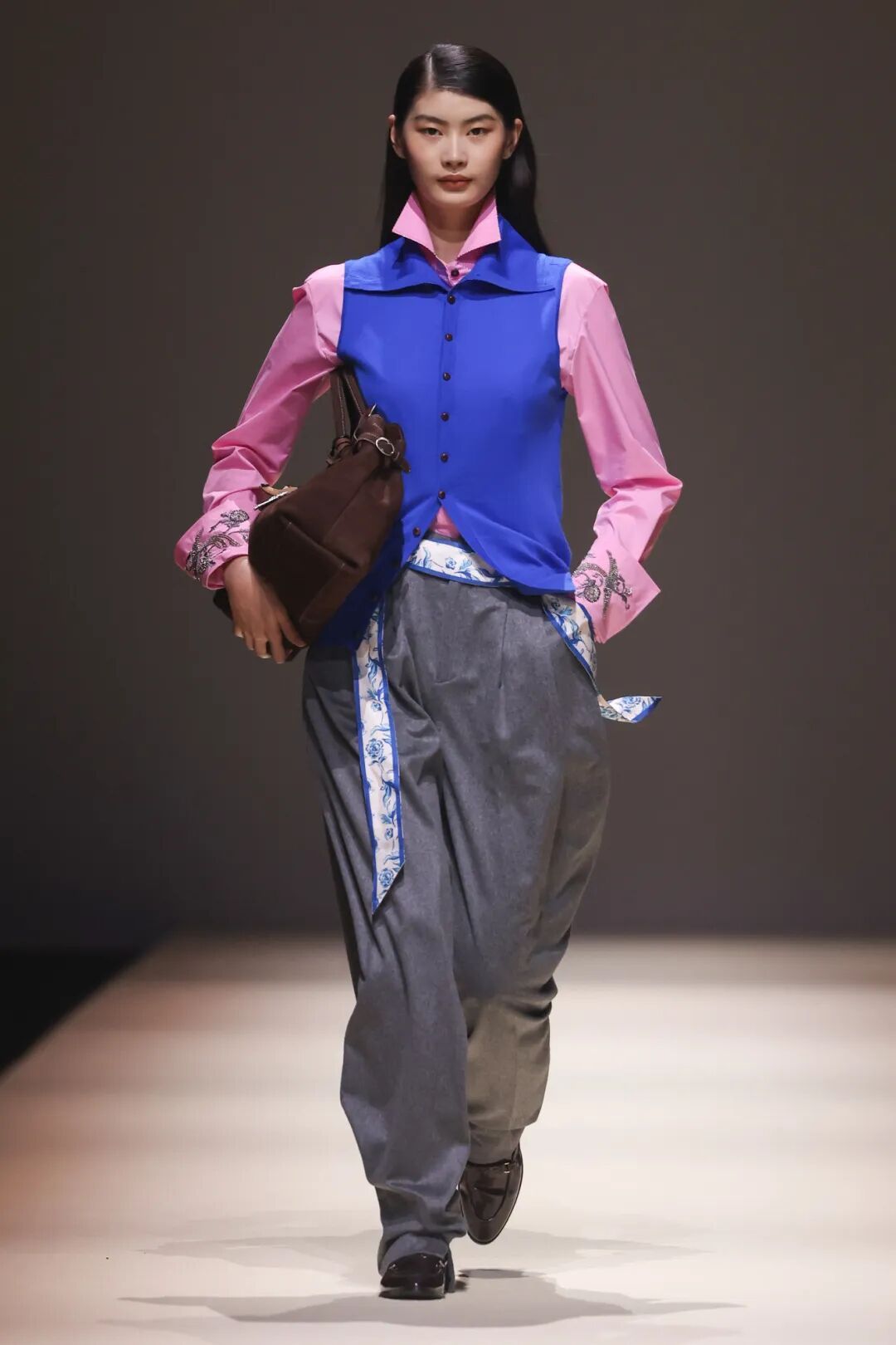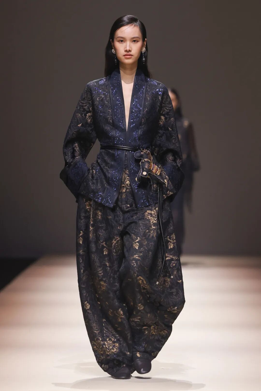 本次大秀跳脱西方秀场范式,以音乐为叙事隐线,特邀中国爵士乐代表人物李晓川领衔上海音乐学院融合乐团现场演绎,融合东方礼乐与爵士即兴打造专属声景体系,实现 “乐随衣动、衣伴乐行” 的沉浸式表达;更首次引入男模阵容,身着融立微领、交襟领等中式元素的 “雅正外套”,为东方美学注入刚柔并济的当代气质。