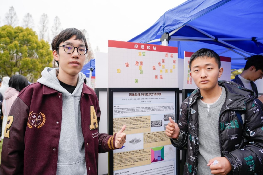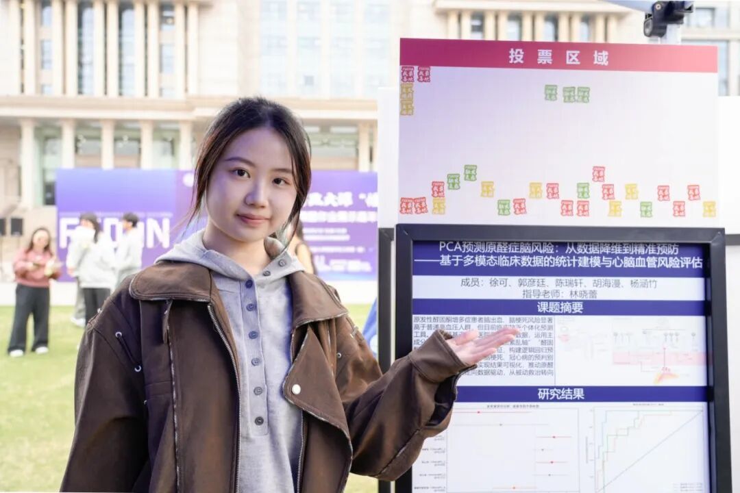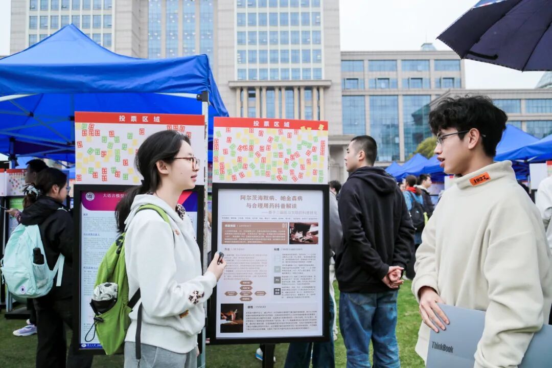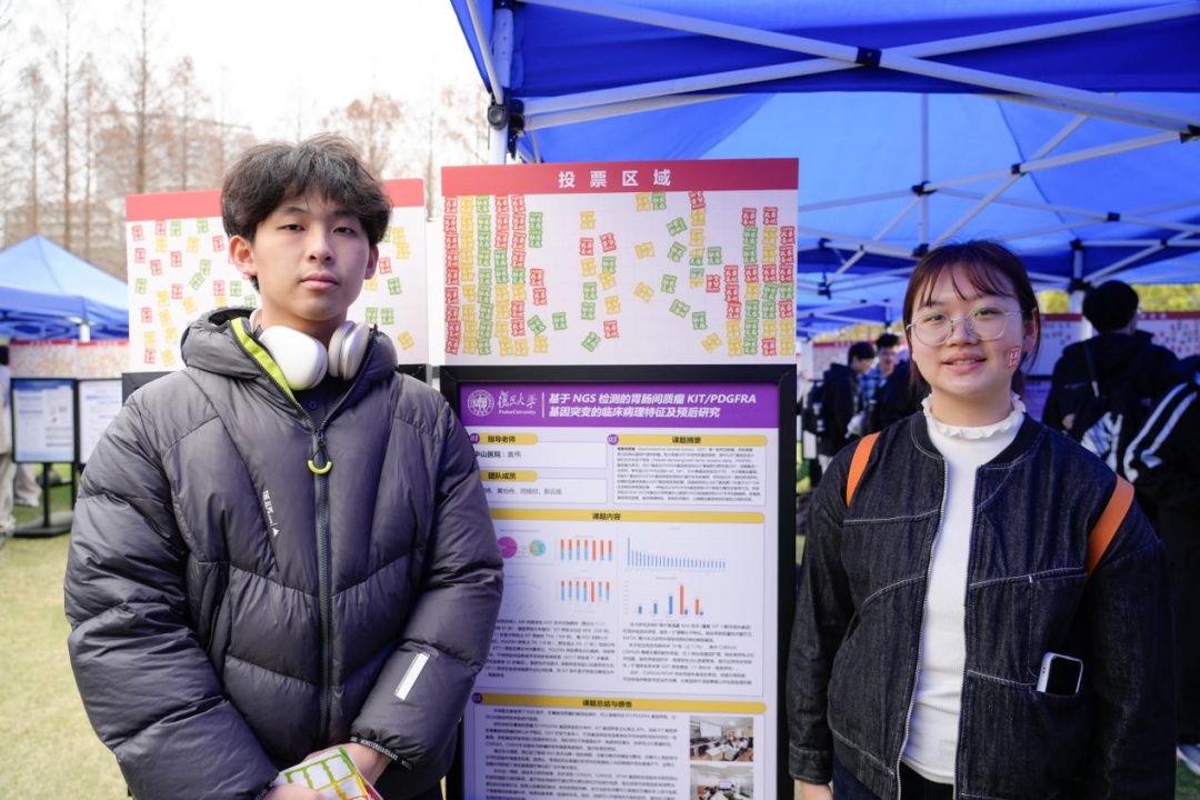 3月最后一天的光草,海报林立,人声鼎沸。 “这个模型能直接用到临床吗?”“数据集开源吗?”“你们是调库还是自己推公式?”……此起彼伏的提问声中,第二届“强国之路”思政大课“悟”阶段2024级本科生课题作业展示嘉年华如约而至。673张海报、3000多名同学,以海报为媒,展开一场跨学科的思想对话。 现场参与的每位同学手持18张贴纸,票选出“我最喜欢的课题”“最想进行交叉碰撞的课题”与“最能触发灵感的课题”。贴纸贴满海报顶部的,就是当天的“人气王”。 校党委书记裘新,校党委副书记钱海红、方明,副校长周磊也来到现场,与同学们交流、 互动。 在大数据学院24级本科生杨涵竹所制作的海报前,一位国际政治专业的同学停下了脚步问道,“你们用的PCA(主成分分析),能不能用在社科量化分析里?” 杨涵竹愣了一下,随即解释起来。她和团队的课题《PCA预测原醛症脑风险:从数据降维到精准预防》是与复旦大学附属华山临床医生开展的。医生们凭借临床直觉发现,原发性醛固酮增多症(原醛症)与心脑血管疾病之间存在关联,但并不明确机制,也缺乏个体化评估工具。 她和团队成员选择利用多模态临床数据建立统计模型,帮助医生预测原发性醛固酮增多症患者的心脑血管风险。“我们拿到的数据有七八十个自变量,但只有六十几个病例。如果直接回归,很容易过拟合,我们就选择主成分分析降维。”杨涵竹指着海报上的模型图解释。虽然所学专业与医学相去甚远,但通过一次次与临床医生线下开会、反复沟通,团队的模型也在不断调整优化。“现在我们发现,PET-CT里的某个影像特征与左心房重构有关系。医生拿到这个结果后,可以去做更深入的机制研究。” “没想到这个原本为罕见病风险预测而建的模型,意外地让一位国际政治专业的同学看到了跨学科方法应用的新可能。”杨涵竹和提问的同学聊了很久,发现这种方法确实可以迁移到社科领域。 在《基于NGS检测的胃肠间质瘤KIT/PDGFRA基因突变的临床病理特征及预后研究》海报前围了不少人,海报上密密麻麻排列着基因突变的图表,看起来颇为专业,却吸引了几位非医学专业的同学。其中,来自生命科学学院的杨谨祎停了很久。 课题成员之一、中山临床医学院24级本科生秦耀炜介绍道,他们主要研究内容是胃肠间质瘤的基因突变与预后关系。团队对246例GIST采用NGS检测方法检测了197个基因,发现在GIST中除了经典KIT、PDGRA等基因突变外,CDKN2A、CDKN2B、MTAP三个基因的纯合性缺失与肿瘤恶性程度显著相关。 “我听得懂她在讲什么,”杨谨祎说,“这个课题相当于给这些肿瘤的作用做了一个初步指示,哪些基因可能是重要的致病基因,对我们后续生物学研究提供了方向。”她把“触发灵感”票投给了这个课题。