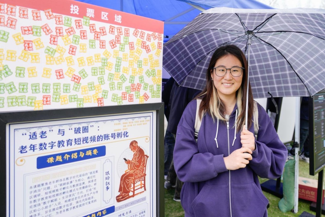 在新闻学院的《“适老”与“破圈”:老年数字教育短视频的账号孵化》课题海报前,则展现了另一种“人机协作”。