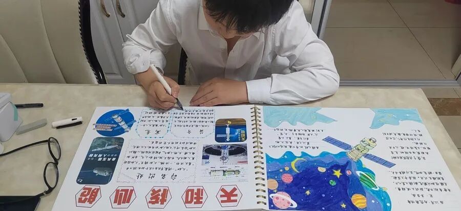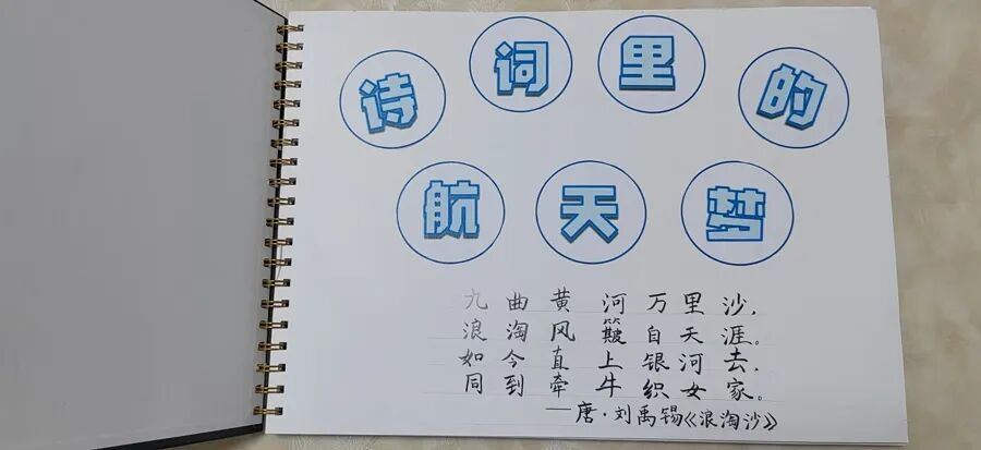 从屈原的《天问》到王勃的“天高地迥,觉宇宙之无穷”,在学习古诗词的过程中,他发现古人对茫茫宇宙有许多表达,古人对宇宙的好奇与今人的航天梦一脉相承。多年来,张书墨坚持动手制作“诗词里的航天梦”画册。
