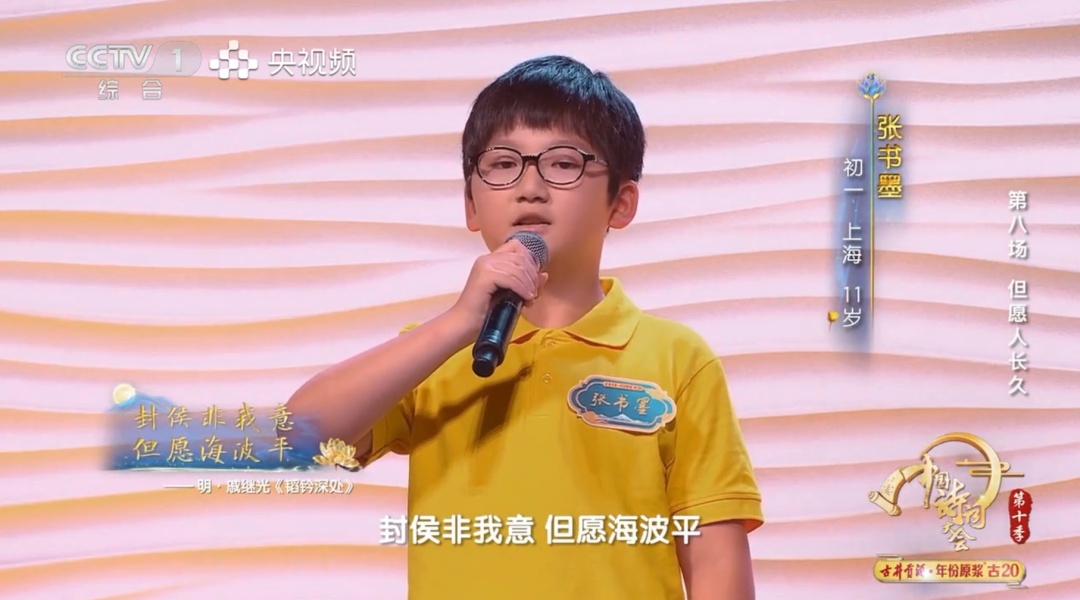 张书墨从小热爱古诗词,至今已掌握800多首。“我喜欢古诗词的朗朗上口,感悟古诗词的魅力,它不是书本上生硬的文字,而是藏着古人喜怒哀乐、山河壮阔的鲜活历史。”