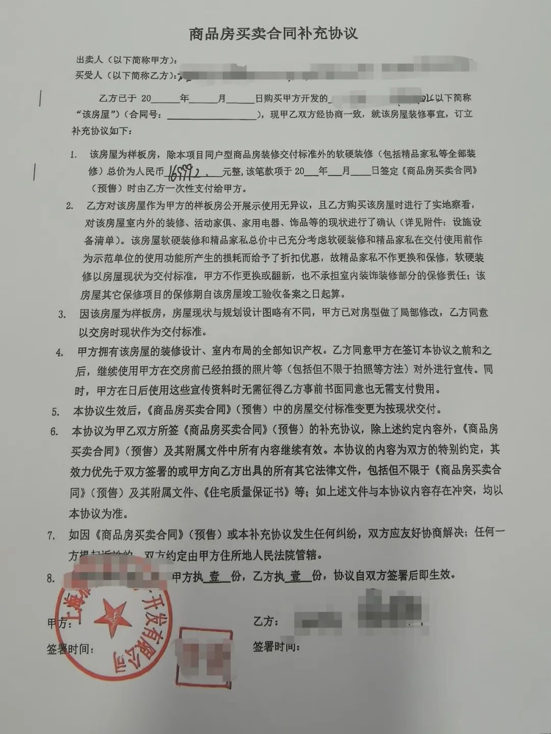 2024年1月23日,刘先生与开发商签订商品房预售合同,同时签订补充协议,约定其所购房屋为样板房,除同户型商品房装修交付标准外,房内软硬装修总价169992元,与房屋一并交付。