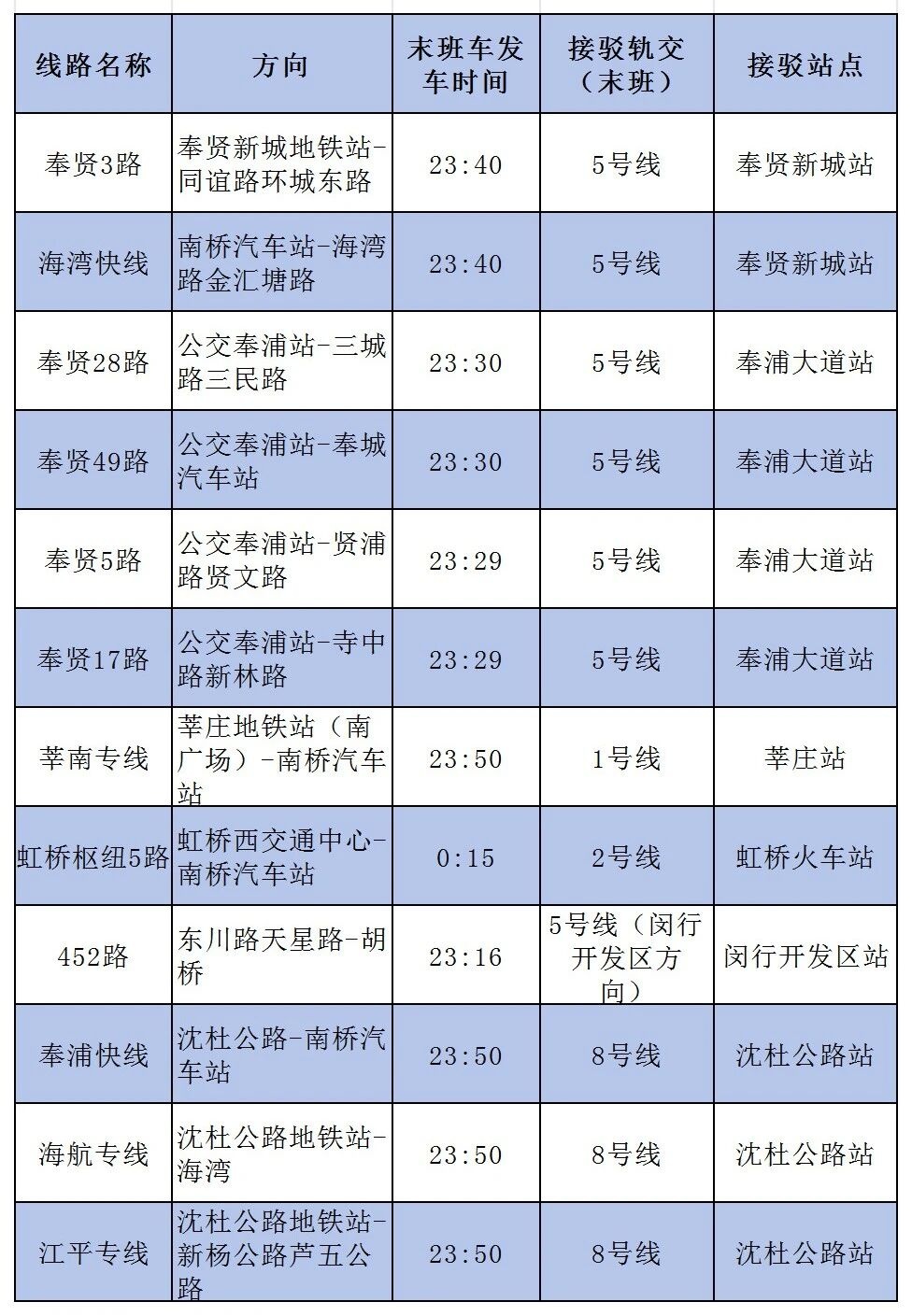 目前奉贤区内共有12条轨交接驳线路,点击下图查看往奉贤方向接驳车末班车发车时间。