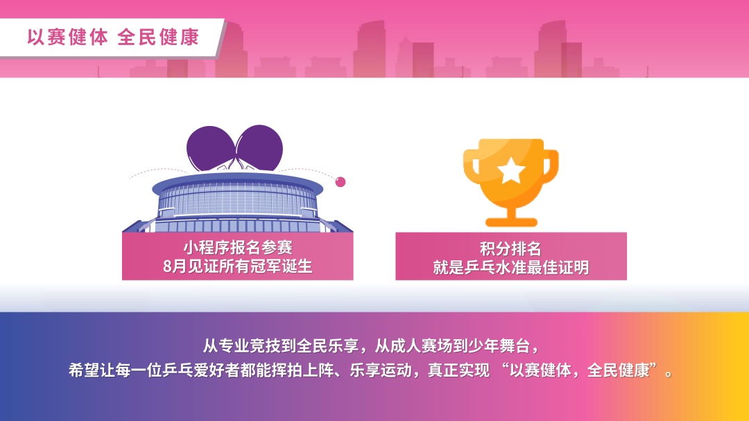 值得一提的是,此次城市个人冠军赛的所有赛事均有积分,比赛的各个名次也都有相应积分,积分榜排名就是乒乓水准的最佳证明。各组别积分前两名的运动员还将有机会参加在8月进行的总决赛。