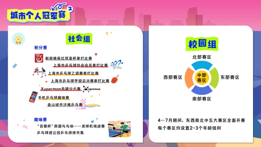 城市个人冠军赛聚焦全民参与,分为社会组、校园组两大组别。社会组依托新民晚报红双喜杯单打赛、上海市乒协会员单打比赛、上海市乒乓球乙级赛单打比赛、上海市乒乓球甲级总决赛单打比赛、Xuperman关键分大赛、手机乒乓球趣味赛、金山城市沙滩乒乓赛等7项赛事活动,设置男子、女子19至39岁组、40至49岁组、50至59岁组、60至70岁组各4个组别。通过设置多赛点、快节奏赛制,吸引市民广泛参与。同步还会在商圈、公园开展趣味乒乓市集、“商圈乓乓响”发球机挑战赛等活动,参与人数上不封顶,欢迎大家一道乒起来。校园组将在4-7月期间,面向7岁至18岁的青少年,共设置男子、女子各12个年龄组别,总共开设4站比赛,每站设立东西南北中五大赛区,参与人群覆盖全市各区少体校、中小学、俱乐部,莘莘学子全城热炼、全季乒乓。
