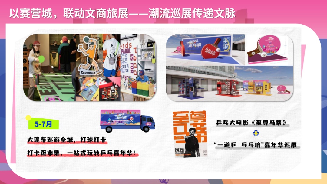 潮流巡展传递文脉。5-7月,“乓乓响”大篷车将开启16区周末巡展,现场将通过大篷车同步直播比赛并进行专业解说,设置发球机器人挑战赛、主题市集等形式与球迷互动,营造沉浸式观赛氛围。同时,乒乓文化巡展也将“进商圈、进校区、进影院”,以影像叙事、实物展示、创意互动等形式重现乒乓发展历史,吸引年轻群体,让乒乓文化潮动申城。