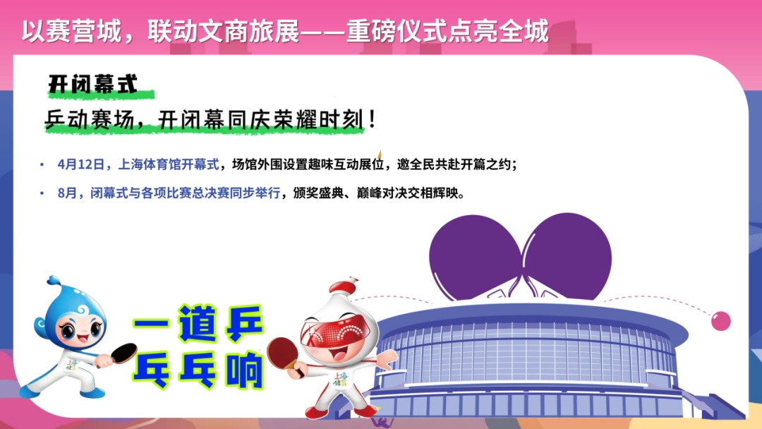 赛事之外,乒乓球嘉年华一场场配套活动也将在申城展开,形成“乒乓搭台、宣传造势、文商旅展唱戏”的创新融合场景,激发全民狂欢。
