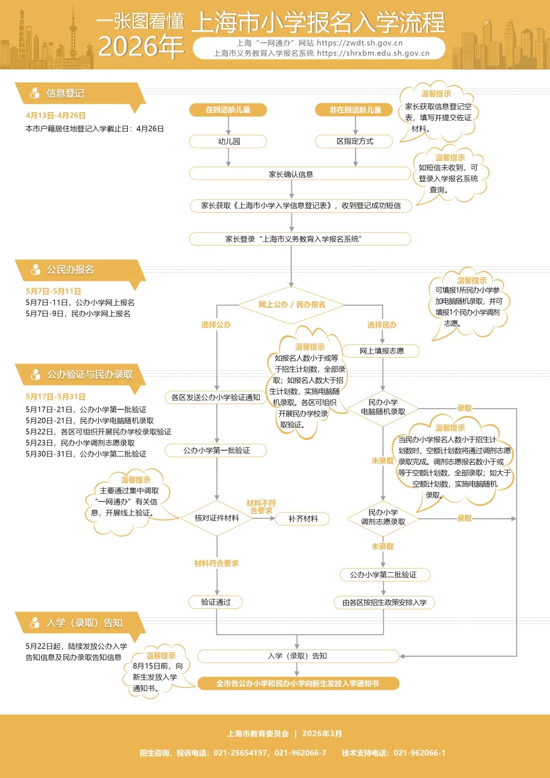 今年上海将持续深入推进“教育入学一件事”应用,优化在线服务,通过“一网通办”网站(zwdt.sh.gov.cn)义务教育入学专栏或“上海市义务教育入学报名系统”(shrxbm.edu.sh.gov.cn)开展义务教育招生工作,相关平台将于4月10日开通。