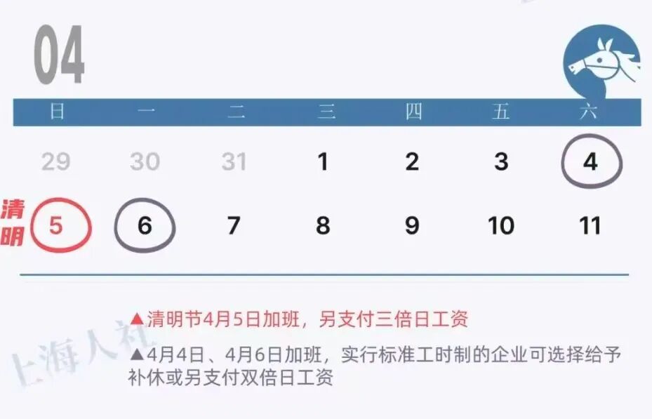 另外,4月5日如有加班,需另支付三倍日工资;4月4日、4月6日加班,实行标准工时制的企业可选择给予补休,如不能补休的应另支付双倍日工资。