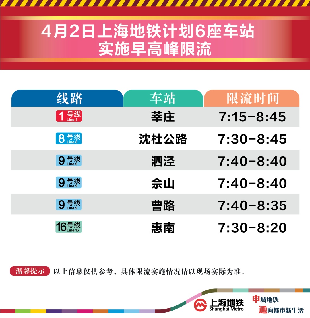4月2日早高峰莘庄、沈杜公路等6座地铁站计划限流