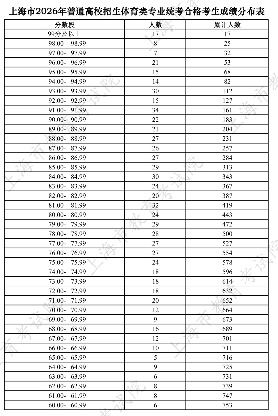 据市教育考试院介绍,上海市2026年普通高校招生体育类专业统考成绩及合格线于3月31日公布。 点击“划重点”极速浏览↓↓↓ 一 体育类专业统考合格线 根据《上海市教育考试院关于印发〈上海市2026年普通高校体育类专业考试招生实施办法〉的通知》(沪教考院高招〔2025〕40号)的有关规定,经审定,上海市2026年普通高校招生体育类专业统考可填报统考院校体育类专业(含认可本市统考成绩的外省市院校)志愿的合格线为:身体素质和专项技术合计总分不低于60分(满分为100分)。 二 成绩查询 3月31日(星期二)10:00起,考生可登录上海市教育考试院官网“上海招考热线”(www.shmeea.edu.cn),点击进入首页“成绩查询”,进行体育类专业统考成绩查询。 三 成绩复核 考生若对本人成绩有疑问,可于4月1日(星期三)9:00—20:00期间登录“上海招考热线”,凭考生高考报名号和身份证号码后六位数字(不含英文字母),点击进入首页“成绩查询”,提交成绩复核申请。成绩复核仅限复核是否存在漏评、加分错、登分错情况,不重新评分。考生不能查阅评分相关材料。 复核结果将于4月3日(星期五)10:00起提供查询。届时考生可再次登录“上海招考热线”,点击进入首页“成绩查询”,查看成绩复核结果。 点击“阅读原文”查看《上海市2026年普通高校招生体育类专业统考合格名单》