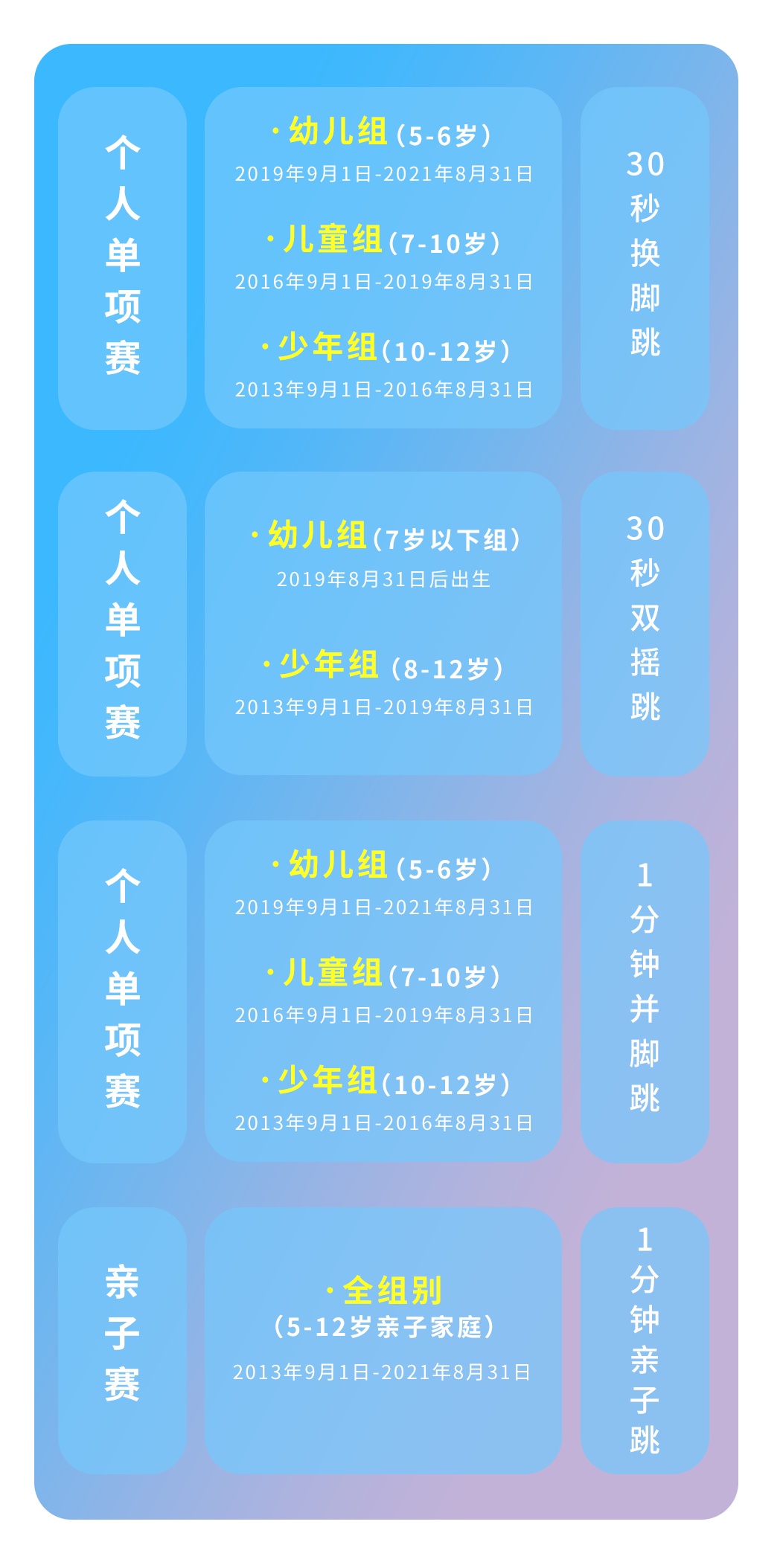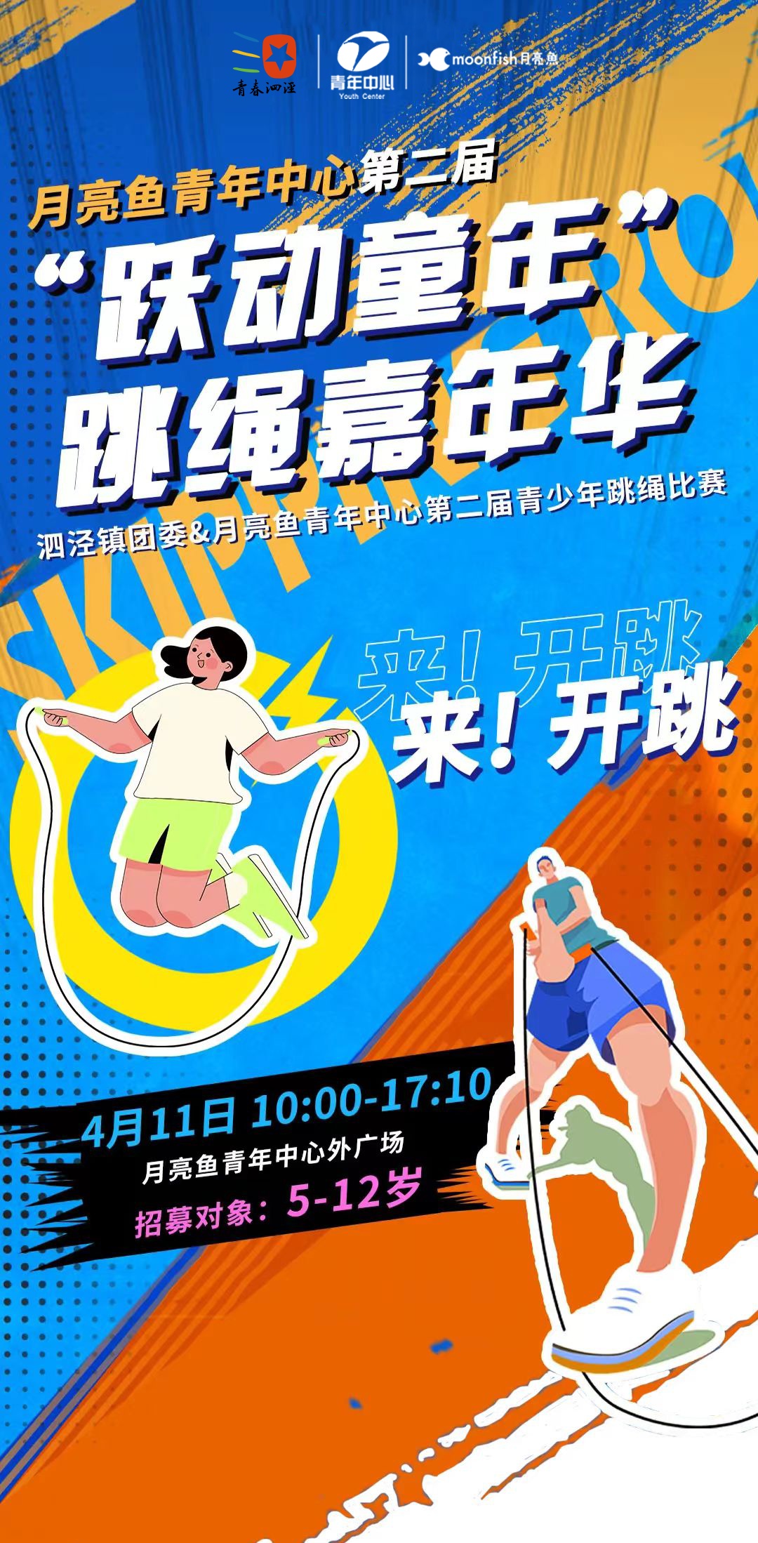免费报名参加,招募5-12周岁符合年龄的跳绳爱好者。