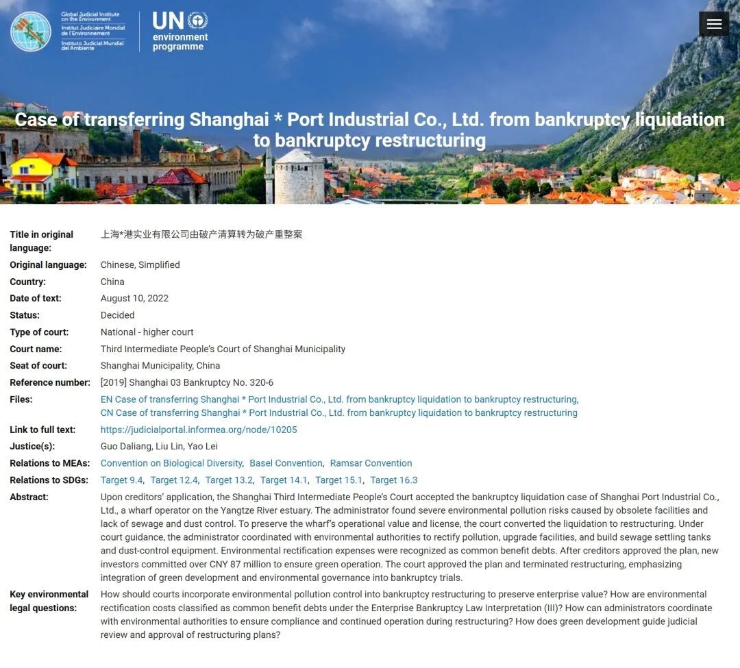 根据中国最高法与联合国环境规划署签署的谅解备忘录中关于加强案例交流的安排,双方商定在联合国环境规划署环境法数据库及相关门户网站设立专门版块,持续发布中国环境资源审判的相关信息,将中国环境司法典型案例与世界各国共享。截至目前,已收录五批55件中国环境资源审判典型案例。联合国多边环境协定信息门户的法律与案例栏目作专题摘要介绍及链接,成为展示中国环境资源审判成效、深化环境司法国际交流合作的重要平台。目前上海法院共3案例入选( 点击查看详情)。