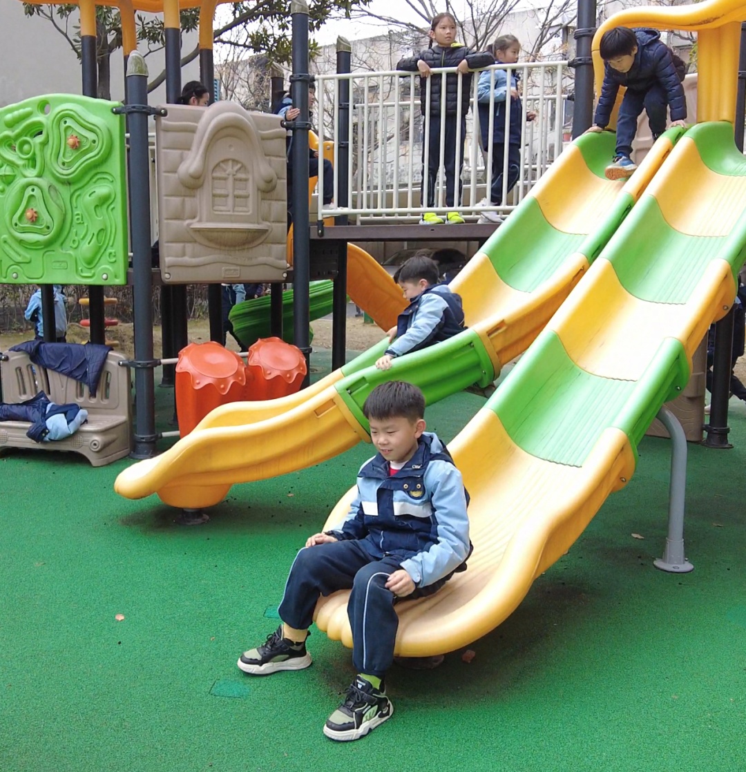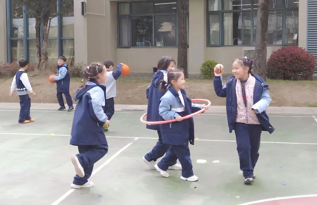 这份未减的运动热情,很快在校园各处蔓延开来。教室门口的走廊上,摆放着跳绳、小乒乓球桌,孩子们随手拿起器材,开展一场简单的比拼;操场上,长绳、滑梯、呼啦圈、投篮、飞盘等设施一应俱全,低年级的孩子从滑梯上轮流滑下,中高年级的孩子则分组进行投篮、飞盘游戏。半个小时左右的自由活动时间,学生的欢声笑语洒满校园。