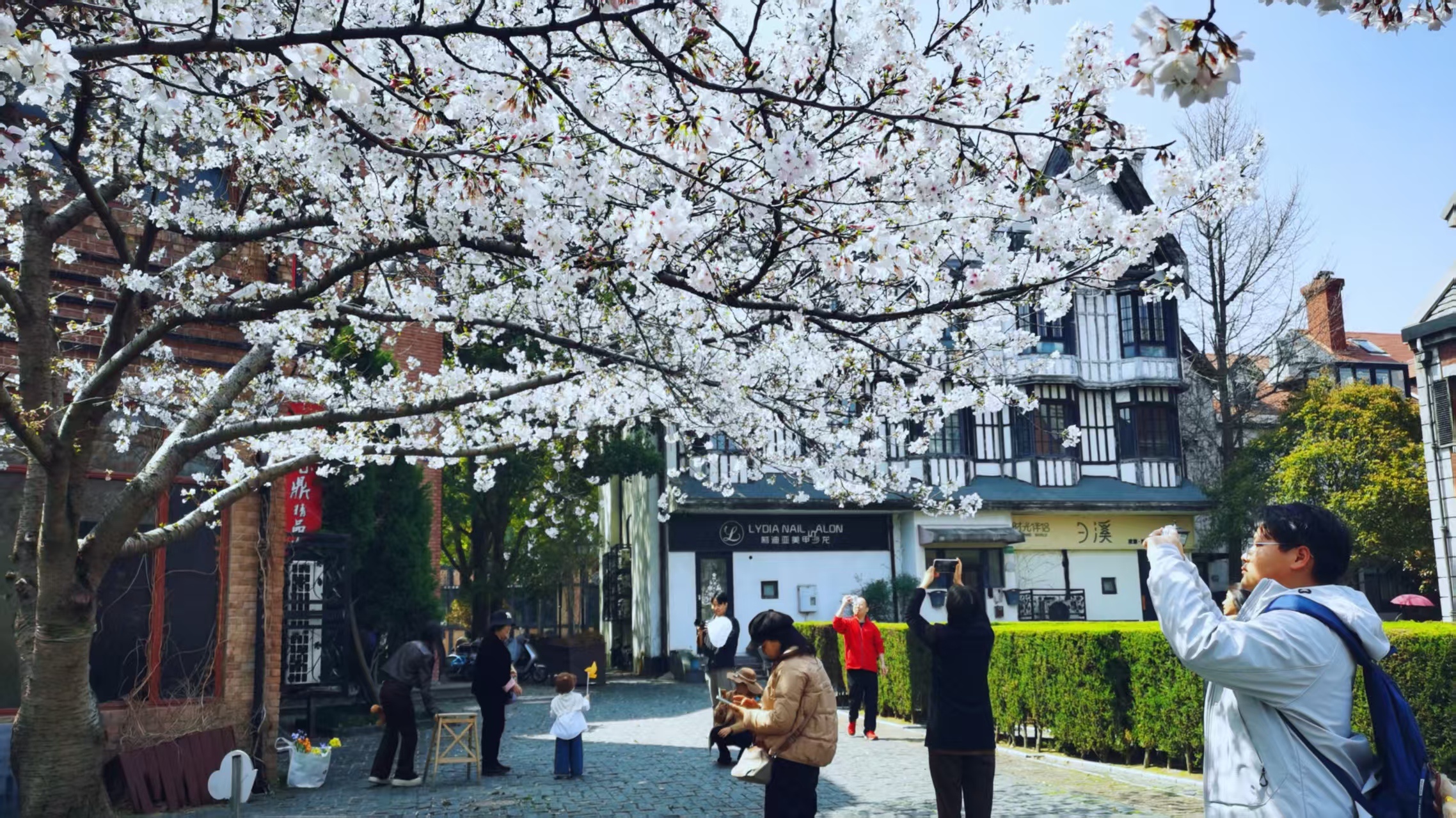 “欧式建筑配上樱花,层次特别美。”来自江苏的游客王女士驻足树下,边拍照边赞叹。泰晤士小镇居民区党总支书记姚丽丽介绍,伯克大街上的这三棵樱花树已是小镇“网红打卡点”,每年花期都吸引众多市民慕名而来。除伯克大街外,居委会周边及路口等处还分布着多处赏樱点,可供漫步寻访。