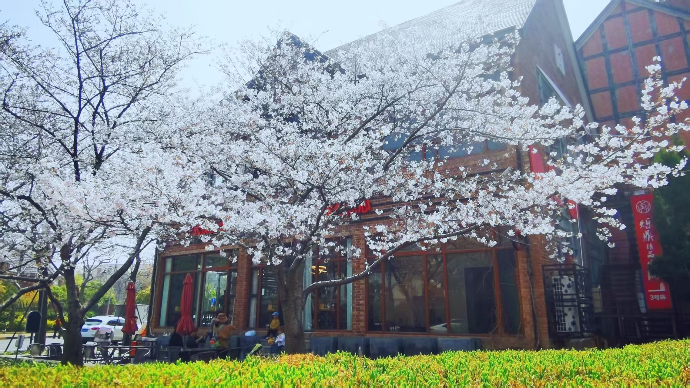 3月31日,小镇伯克大街上,三棵吉野樱进入盛花期,繁密白花缀满枝头,在蓝天映衬下如云似雪。树下广场上,游客纷纷举机取景,将樱花与都铎风格建筑同框定格;一旁餐厅将桌椅摆至户外,食客临花而坐,悠然尽享春日惬意。