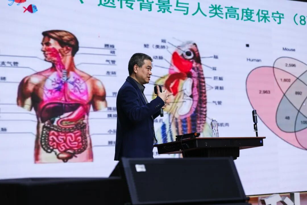曹教授重点阐释斑马鱼成为 “科研明星” 的核心优势:与人类基因相似度达87%,药物靶点、代谢机制高度保守;体型小、易饲养、繁殖快、成本低;胚胎透明、发育快速,便于实时观察与药物筛选;同时实验技术成熟、仪器完备,是新药研发与脉管病研究的理想模型,更成功入驻我国空间站,展现重要科研价值。