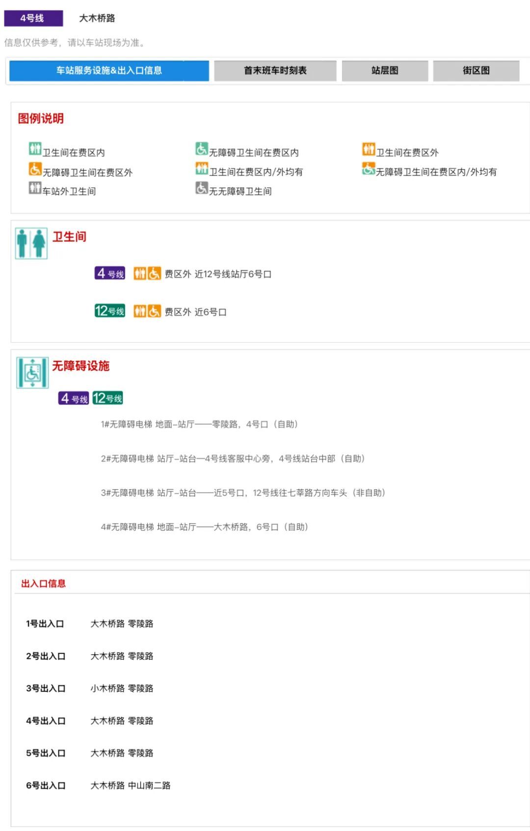 目前,大木桥路站共有6个出入口,通往零陵路、大木桥路、小木桥路、中山南二路;站内服务设施齐全,设有4部无障碍电梯,方便乘客换乘和进出站;还有2个卫生间,分别位于费区内和费区外。