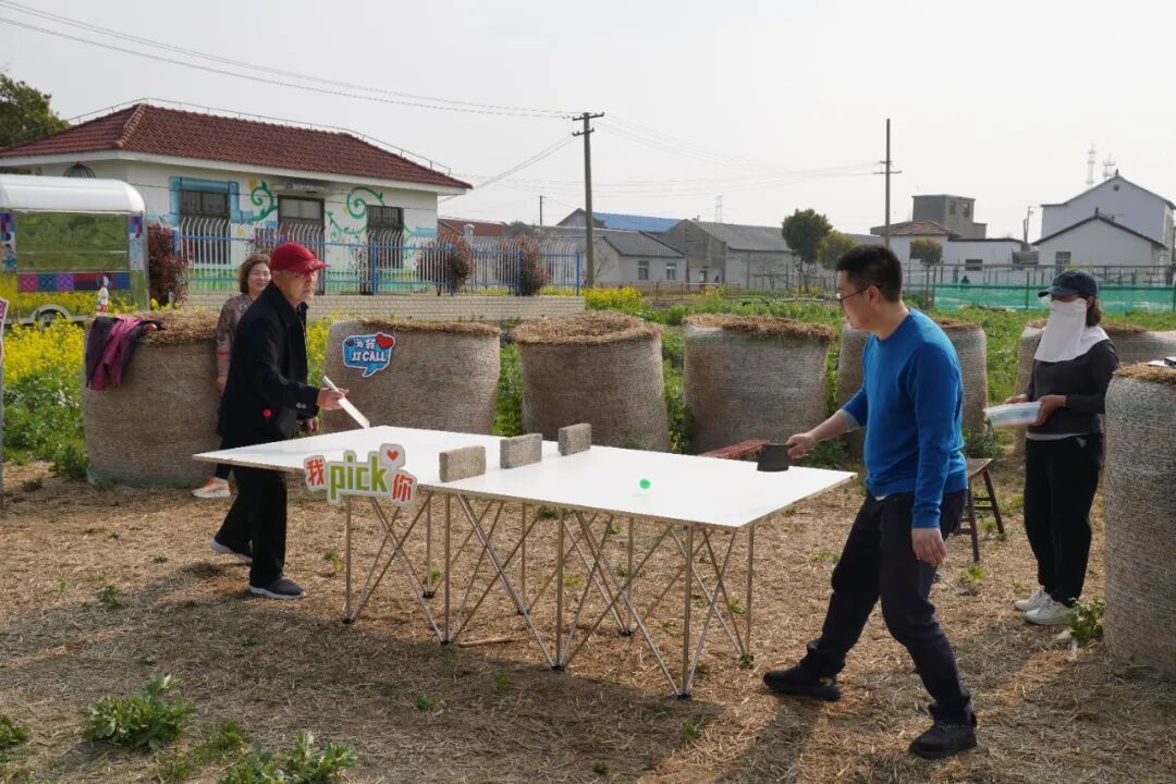 活动现场,一张由旧木板、两张板凳、三块砖头简易搭成的乒乓球桌,成为了最亮眼的“主角”。村民们翻出的“压箱底”工具——菜刀、纸扇、文件夹、电蚊拍、小锅铲、隔热垫,都成了独一无二的另类球拍。望新幼儿园的孩子们和当地村民齐聚一堂,在稻草堆旁展开了一场妙趣横生的比拼。