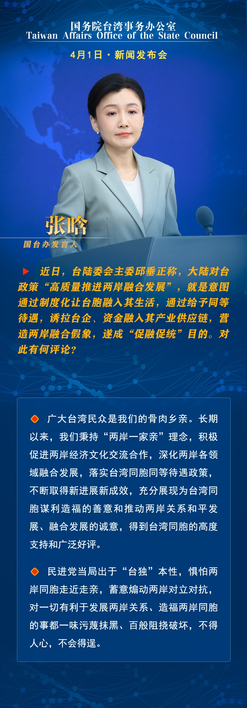 国台办:和平统一后,台湾同胞再也无需为各种能源物资短缺而焦虑