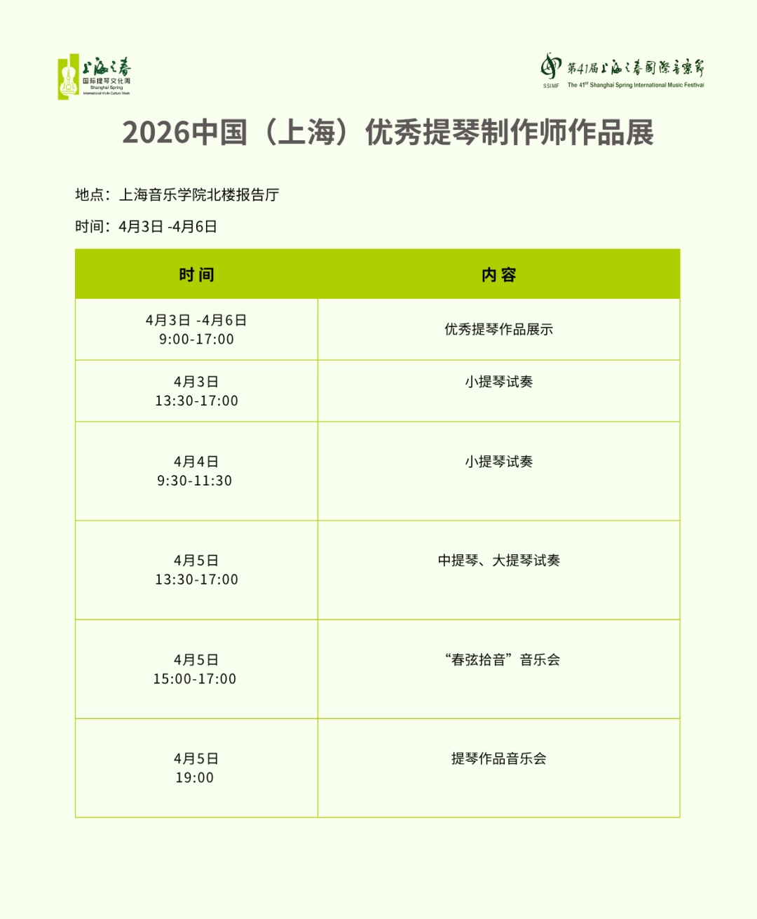 从管弦乐艺术发展史展览到音乐公益论坛,多元城市活动贯穿全程。2026年4月3日至13日,让我们相约上海,在名琴的悠扬旋律中感受艺术魅力,在工坊的匠心坚守中触摸文化根脉,在城市的烟火气息中邂逅音乐浪漫。关注提琴周日程安排,抢手速的时间到啦,扫码小程序一键锁定你心仪的活动。