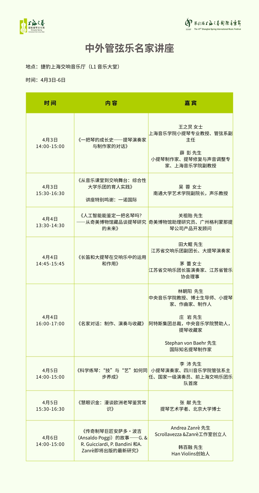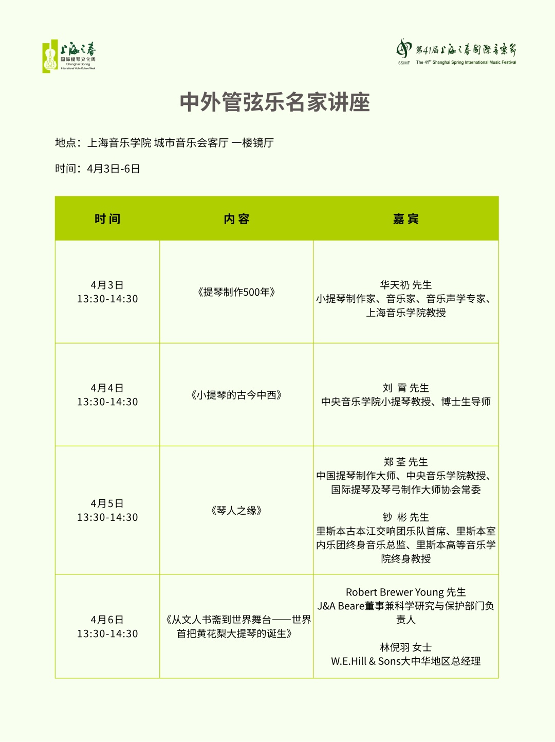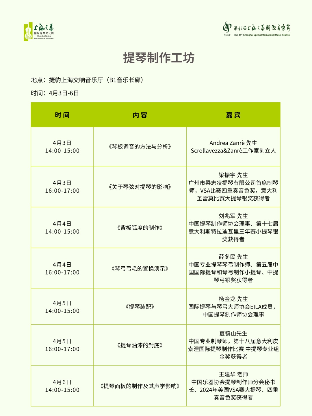小提琴家林朝阳、李沛、王之炅、刘霄,提琴制作大师郑荃、华天礽、斯蒂芬·冯·巴伦(Stephan von Baehr)等名家大咖,将带来演奏、教学、鉴赏、制作、收藏等丰富内容,兼顾专业深度与大众普及,适配专业乐手、音乐院校学生、音乐学习家庭、古典乐爱好者等不同受众需求。