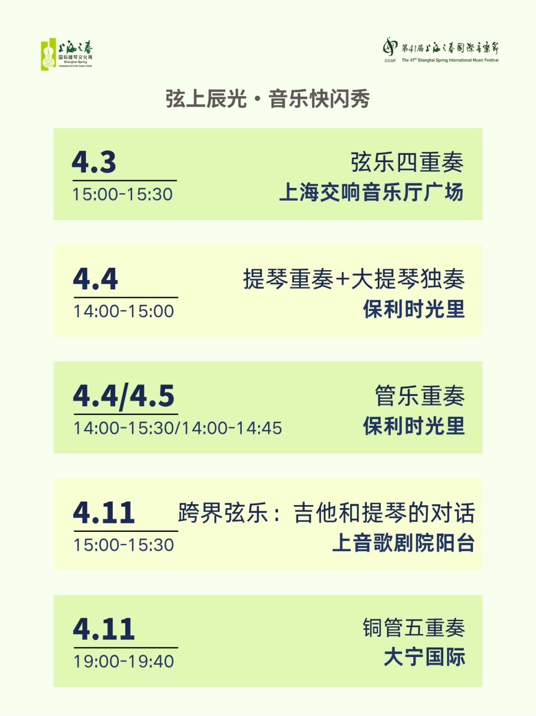 打造多场“弦上辰光”音乐快闪秀,从捷豹上海交响音乐厅、上音歌剧院,到保利时光里、大宁国际商业广场等城市地标,提琴重奏、管弦乐重奏等演绎轮番上演,让市民在街头巷尾邂逅惊喜弦音,奏响“全城乐动、全民共享”的春日交响。