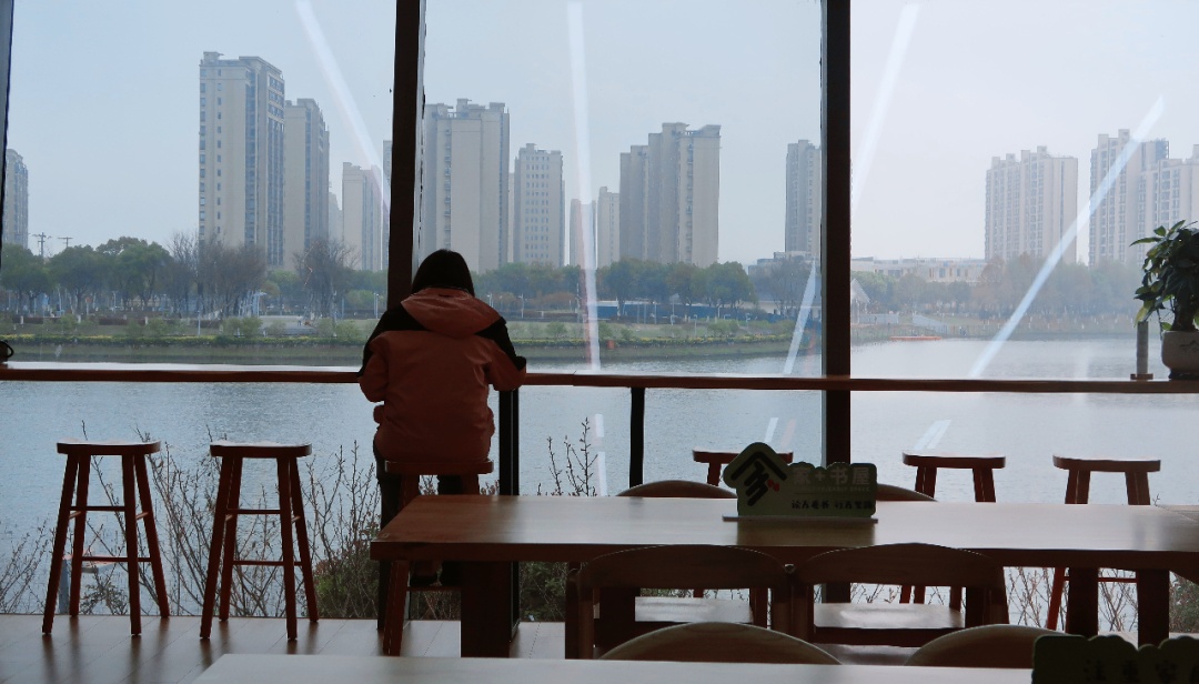 三面落地玻璃窗将天光与湖景尽数引入,阳光轻轻落在桌面。市民们靠窗而坐,或低头静读,或抬眼赏湖,书香与自然相映,静谧而惬意。