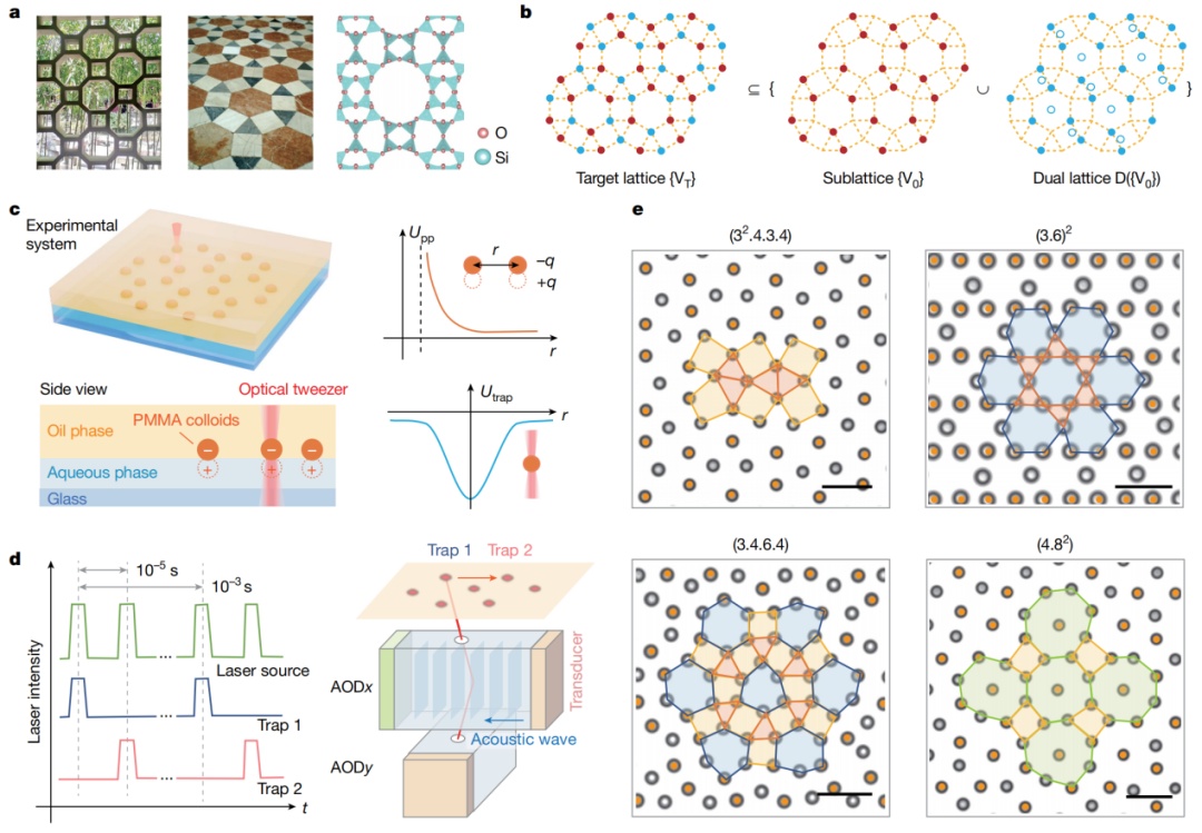 (a) 建筑装饰与材料中的复杂对称性晶格结构;(b) 复杂晶格的对偶子晶格分解示意图;(c-d) 基于声-光耦合光镊技术的二维胶体实验系统;(e) 基于“对偶对称性引导”自组装范式构建的复杂胶体晶格。