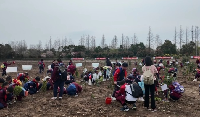 另一边,一群中小学生正忙着种植瓜子黄杨。挖土坑、栽种、覆土,不少孩子初次体验,兴致勃勃。