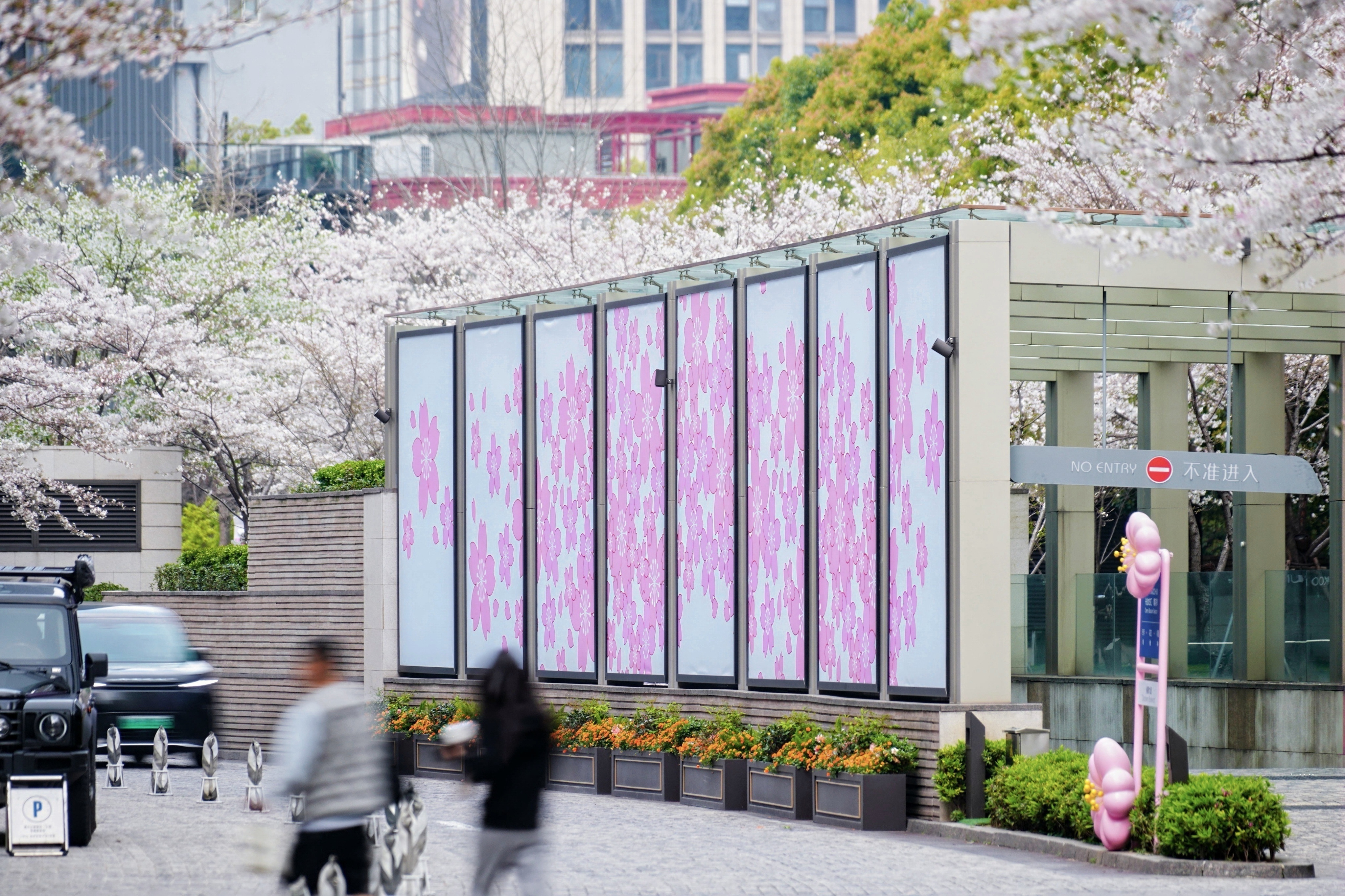 自兴业太古汇L1室内至愉景大道,沿途设立樱花主题站牌与打卡相框,室内游逛氛围与室外踏青体验自然衔接,春日气息弥漫在整个场域。