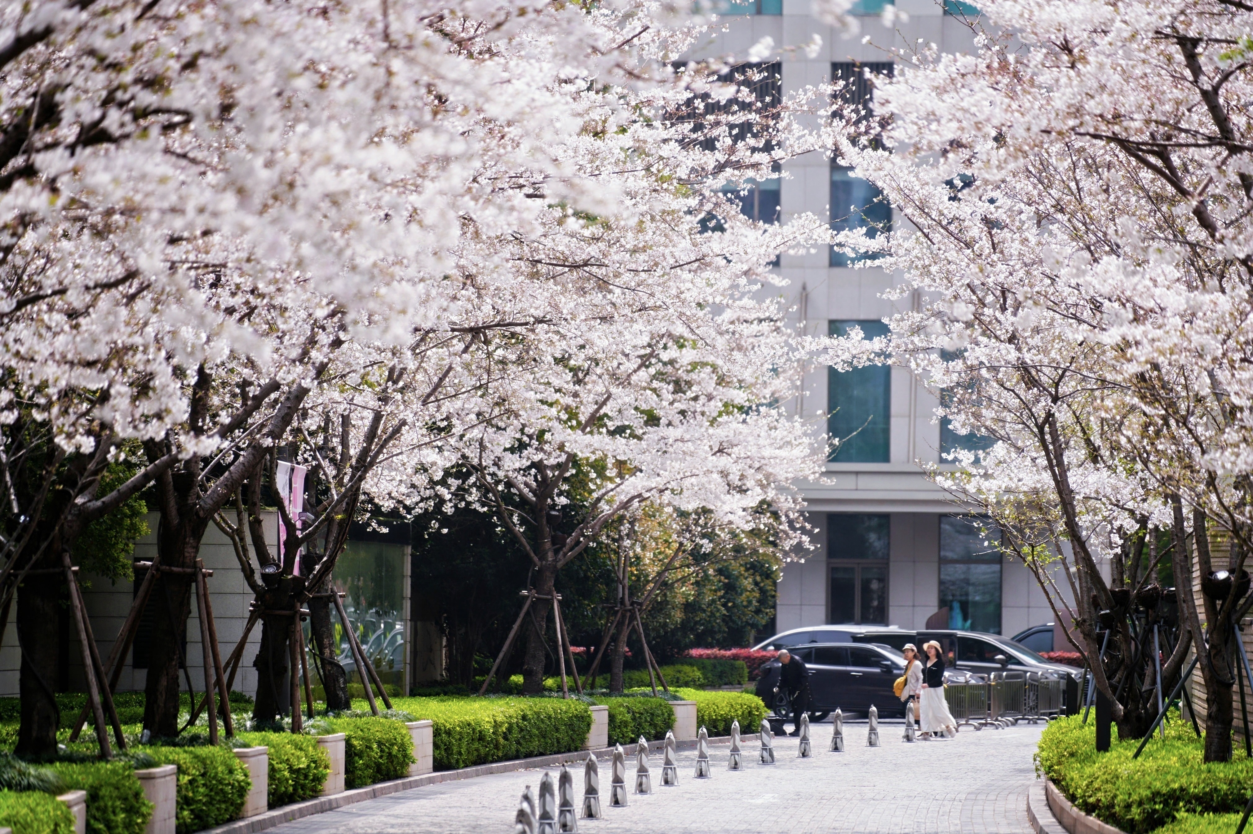 作为兴业太古汇四季流转中独具辨识度的户外空间,愉景大道一端连着北广场、另一端连着南花园,一年四时各成风景。近日,愉景大道迎来樱花最盛之时,近百株樱花沿路列植、如云似雪,引领消费者进入春色满盈的赏花之旅,为都市消费生活增添难得的沉浸意趣。