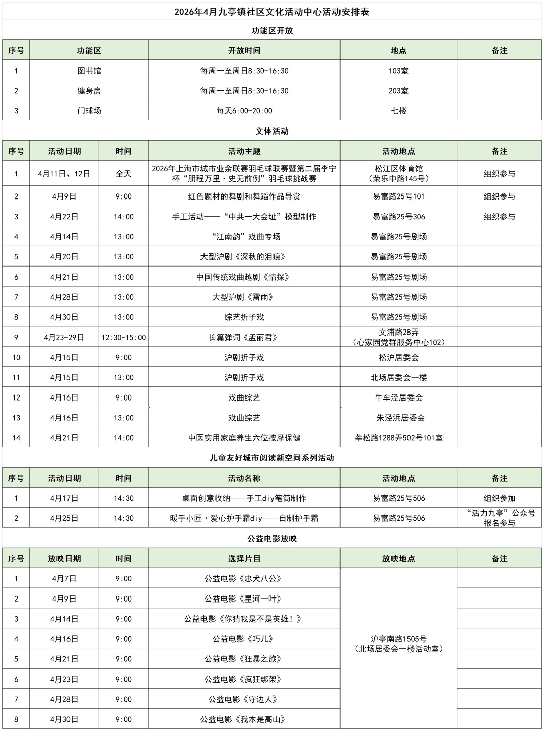 九亭镇|九亭镇社区文化活动中心4月份主题活动安排&免费公益电影排片表来啦!